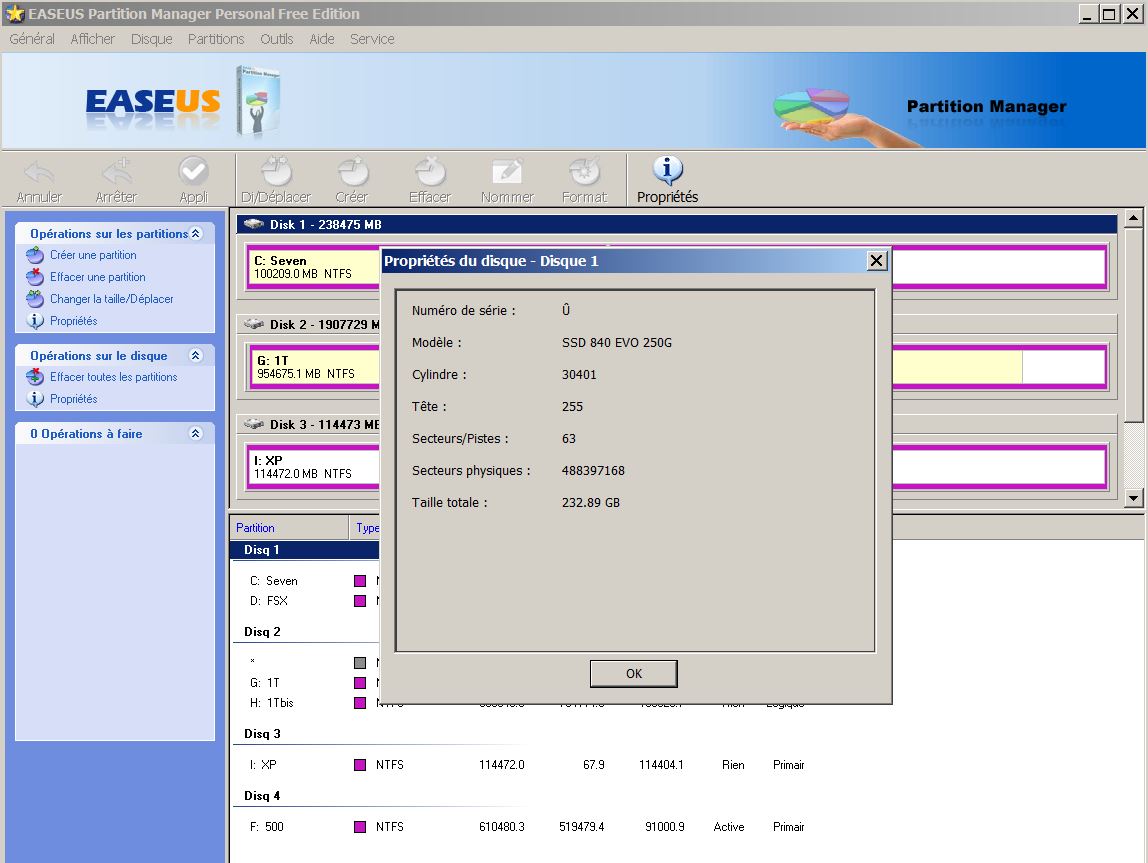 On voit bien que sur Seven, par exemple, il y a "disk 1 - 238475MB, et dans les propriétés, on y voit ces indications !